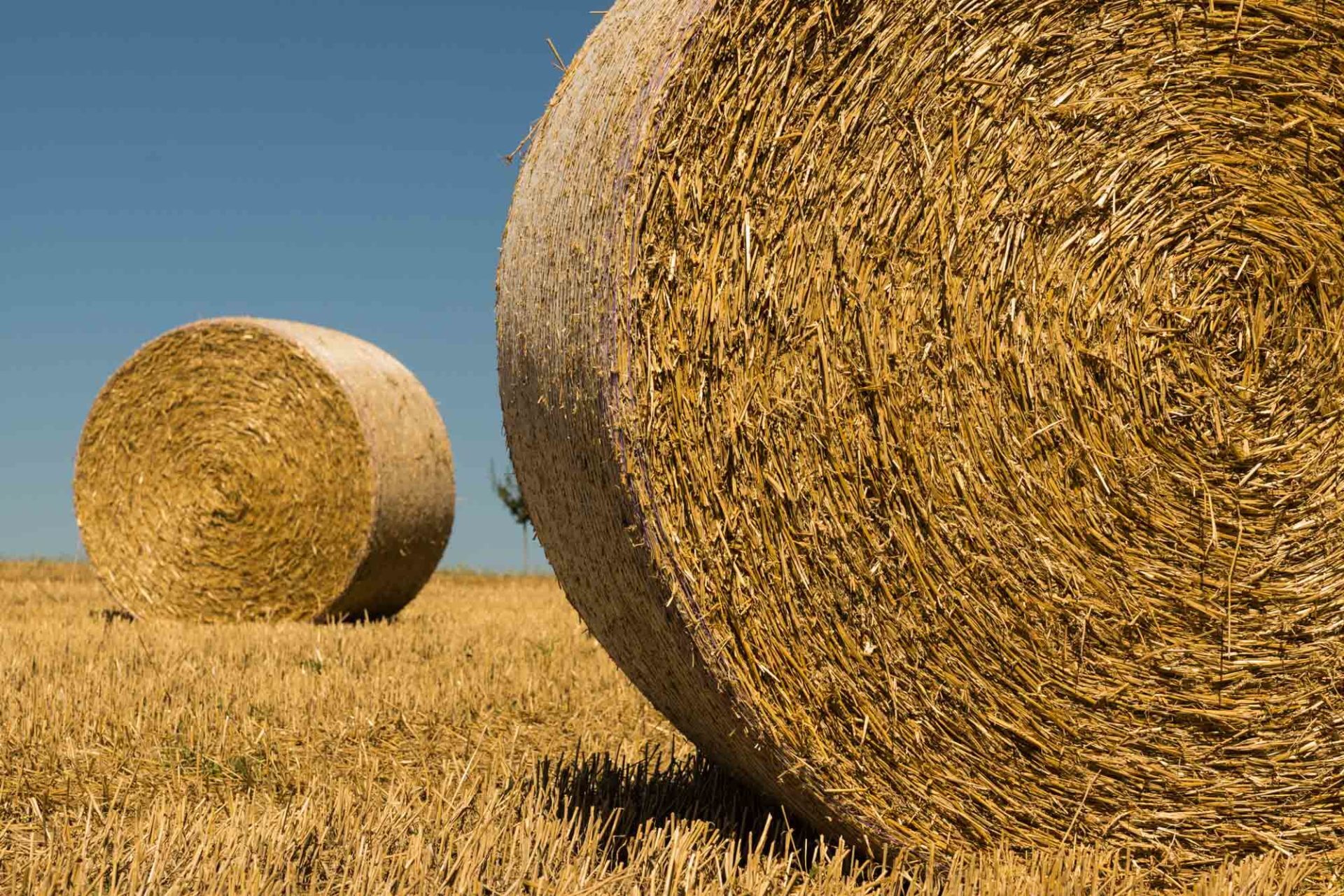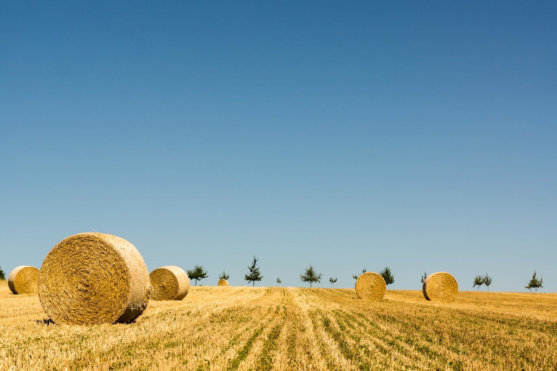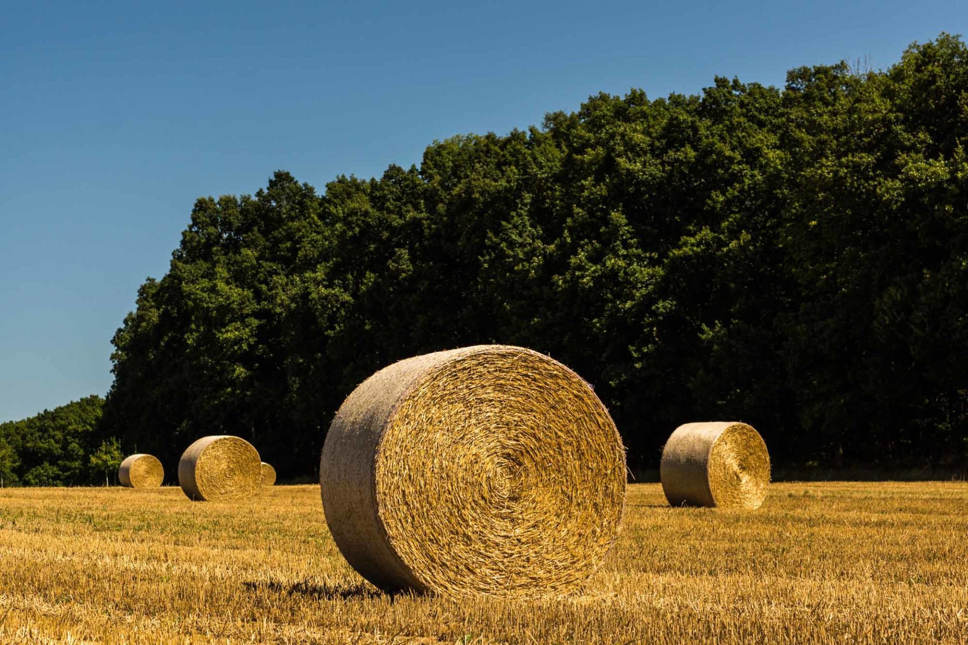 Die Horizontlinie wurde durch einen niedrigen Kamerastandpunkt in den Bildern immer im unteren Drittel gehalten. Des Weiteren folgte dann die ganze Konzentration auf die Formen der Strohballen, die mal formatfüllend angeschnitten wurden oder gestaffelt neben- und hintereinander platziert wurden. Besonderes Augenmerk habe ich auch auf die Tiefenschärfe in den Bildern gelegt. Klar muss der Strohballen mit dem nächsten Punkt zur Kamera scharf eingestellt sein. Aber weiter weg zum Hintergrund hin wollte ich die Schärfe bewusst abnehmen lassen. Dies ist auch deutlich sichtbar an den kleinen Bäumchen am Horizont. Dazu wurden auch alle Bilder mit einer Maximalblende von f/5,6 gemacht.