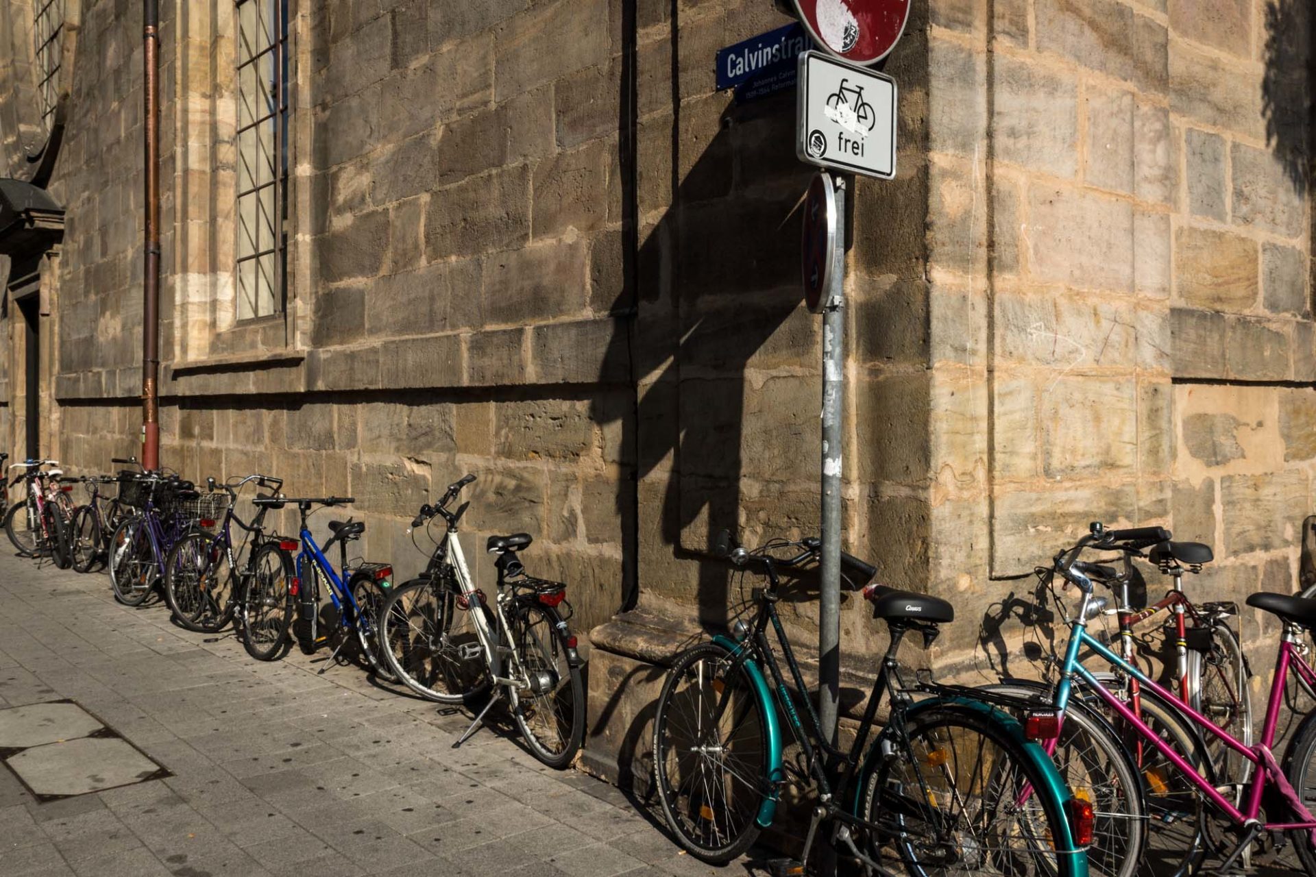 Bei einem Spaziergang durch Erlangen ist es unvermeidlich, nicht über das Thema Fahrräder zu stolpern. Man muss gar nicht gezielt danach suchen, sondern die Motive liegen einem geradezu zu Füßen. Man braucht einfach nur den Ausschnitt zu wählen und hat in kürzester Zeit jede Menge Bilder im Kasten. Natürlich gelten auch hier die Gestaltungsregeln der Fotografie. Beachtet man die Linienführung und die Figur Grund Beziehung, schälen sich die Motive klar heraus. Ich hatte großen Spaß beim Fotografieren der teilweise ineinander verkeilten Fahrräder und auch später bei der Auswahl am Monitor, welches Bild wohl die beste Wirkung hat.