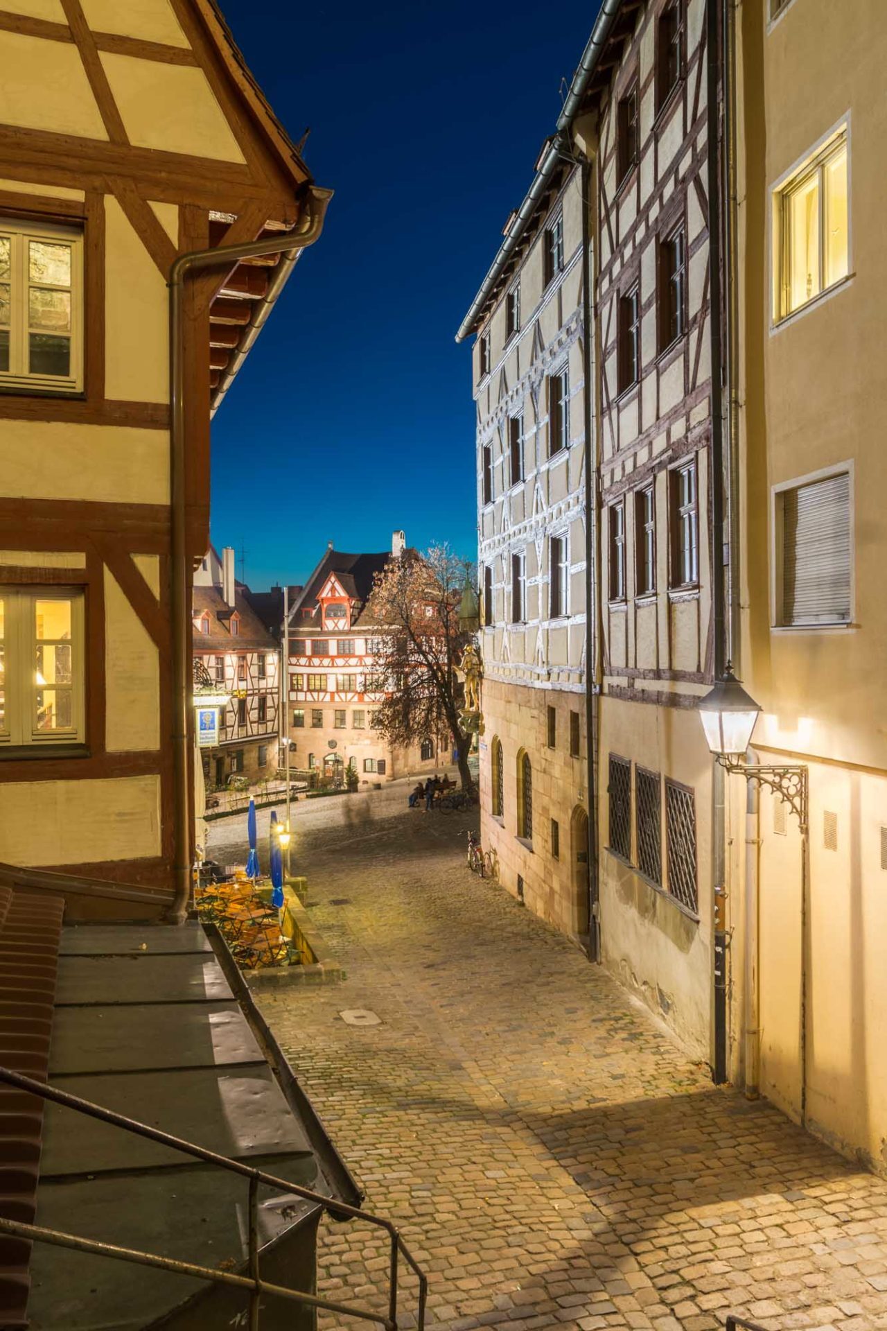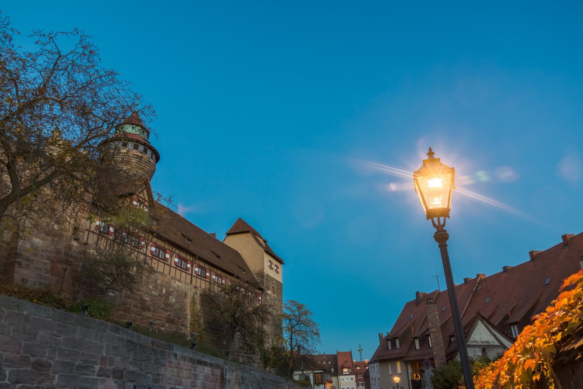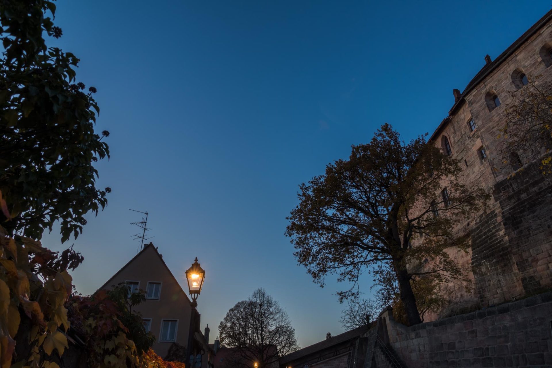 Fotografie bei Nacht bedeutet heute Aufnahmen in HDR zu machen. Zu hoch sind die Kontraste, als dass ein digitaler Sensor diesen kompletten Umfang erfassen könnte. Nachtaufnahmen in Nürnberg habe ich aber auch schon vor 30 Jahren mit der analogen Spiegelreflexkamera gemacht. Fotografiert wurde auf Diafilm und man kann sicher sein, dass auch schon damals der Kontrastumfang dieser Filme nicht ausgereicht hat, diese Kontraste einzufangen. Wie hat man es denn damals gemacht? Ganz klar, man ist bereits vor der blauen Stunde am gewünschten Ort gewesen und hat sich mit den Einstellungen an der Kamera vorbereitet. Die blaue Stunde ist für Fotografen deshalb ideal, weil in dieser Zeit die Helligkeit der Umgebung und des Abendhimmels noch in etwa der Helligkeit des aus den Fenstern scheinenden Lichtes entspricht. So hat man vor dem Einbruch der Nacht hier in unseren Breiten circa eine halbe Stunde mit ausgewogenen Lichtverhältnissen zur Verfügung. Je nach Motiv musste man sich bei der analogen Fotografie noch entscheiden, ob man auf die Lichter oder auf die Schatten belichtet, was dann zur Folge hatte, dass entweder die Lichter ausgebrannt oder die Schatten zugelaufen waren. Dank der HDR-Technik ist dieses Problem heute überwunden.