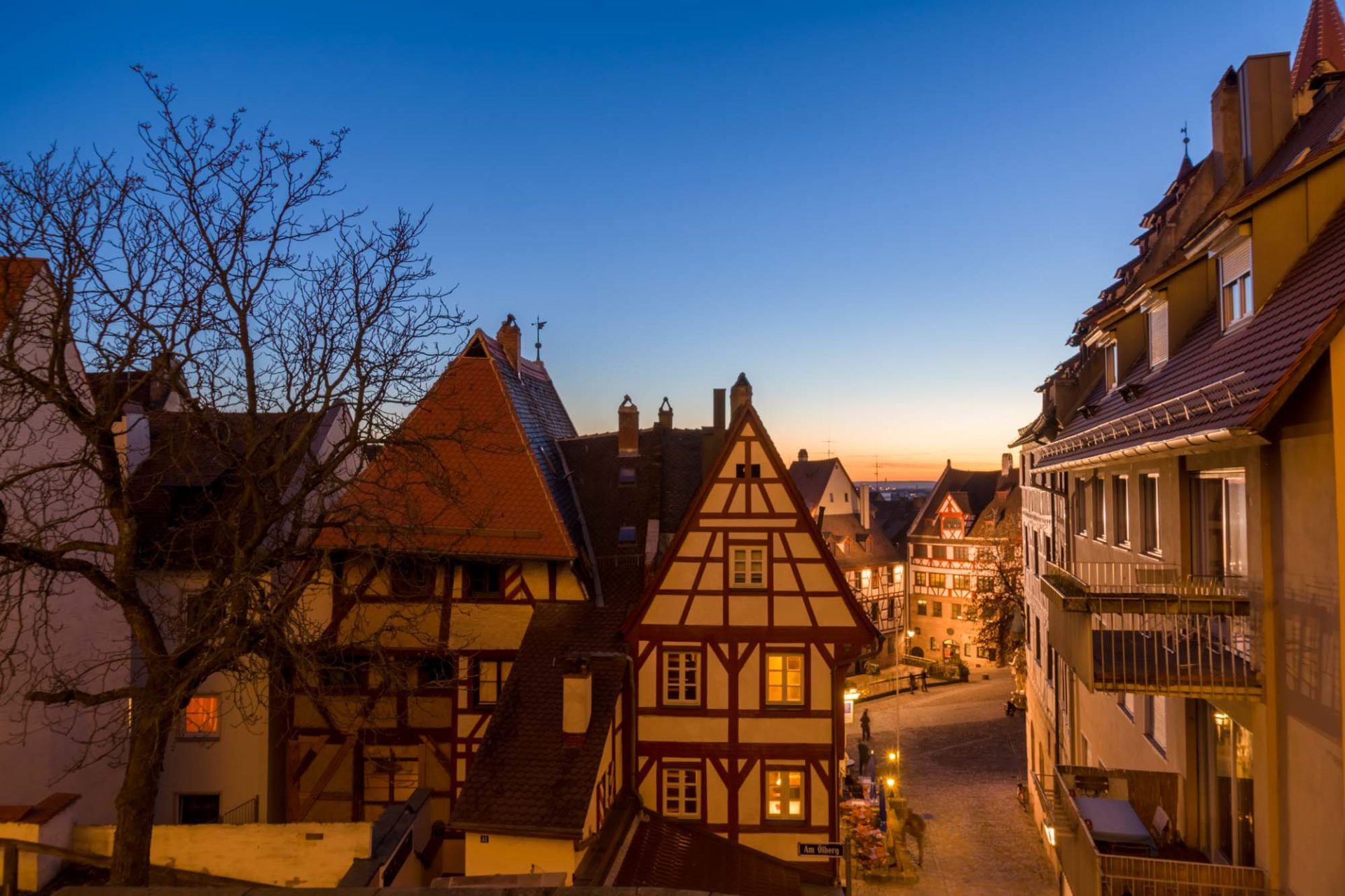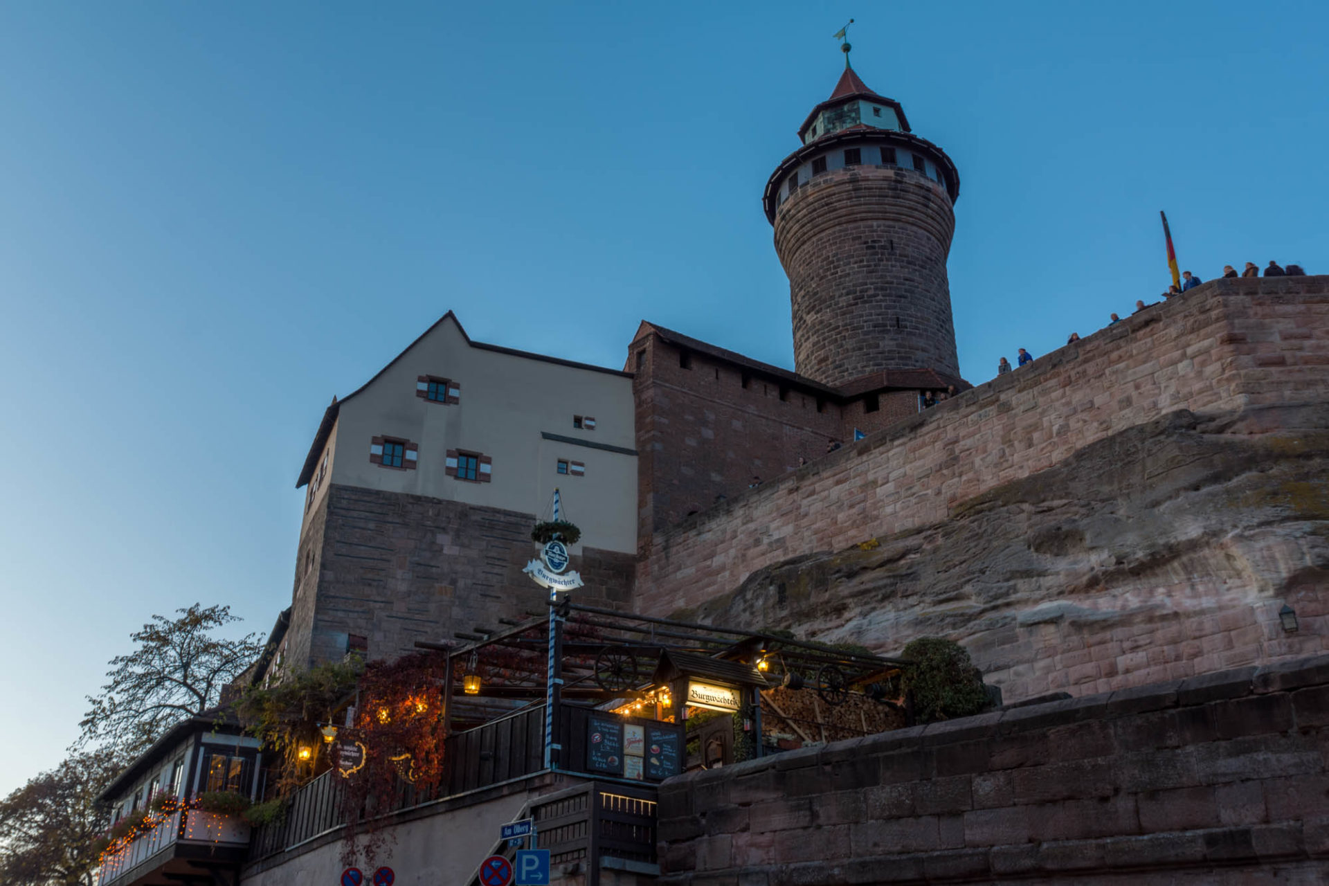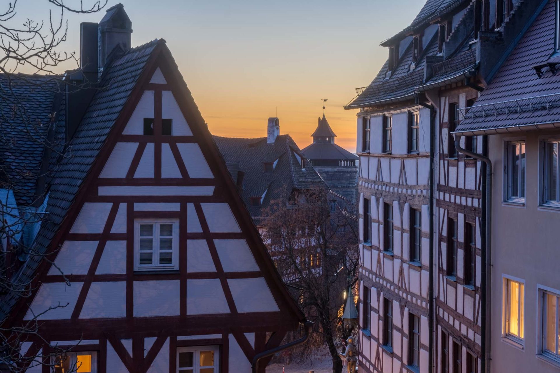 Fotografie bei Nacht bedeutet heute Aufnahmen in HDR zu machen. Zu hoch sind die Kontraste, als dass ein digitaler Sensor diesen kompletten Umfang erfassen könnte. Nachtaufnahmen in Nürnberg habe ich aber auch schon vor 30 Jahren mit der analogen Spiegelreflexkamera gemacht. Fotografiert wurde auf Diafilm und man kann sicher sein, dass auch schon damals der Kontrastumfang dieser Filme nicht ausgereicht hat, diese Kontraste einzufangen. Wie hat man es denn damals gemacht? Ganz klar, man ist bereits vor der blauen Stunde am gewünschten Ort gewesen und hat sich mit den Einstellungen an der Kamera vorbereitet. Die blaue Stunde ist für Fotografen deshalb ideal, weil in dieser Zeit die Helligkeit der Umgebung und des Abendhimmels noch in etwa der Helligkeit des aus den Fenstern scheinenden Lichtes entspricht. So hat man vor dem Einbruch der Nacht hier in unseren Breiten circa eine halbe Stunde mit ausgewogenen Lichtverhältnissen zur Verfügung. Je nach Motiv musste man sich bei der analogen Fotografie noch entscheiden, ob man auf die Lichter oder auf die Schatten belichtet, was dann zur Folge hatte, dass entweder die Lichter ausgebrannt oder die Schatten zugelaufen waren. Dank der HDR-Technik ist dieses Problem heute überwunden.