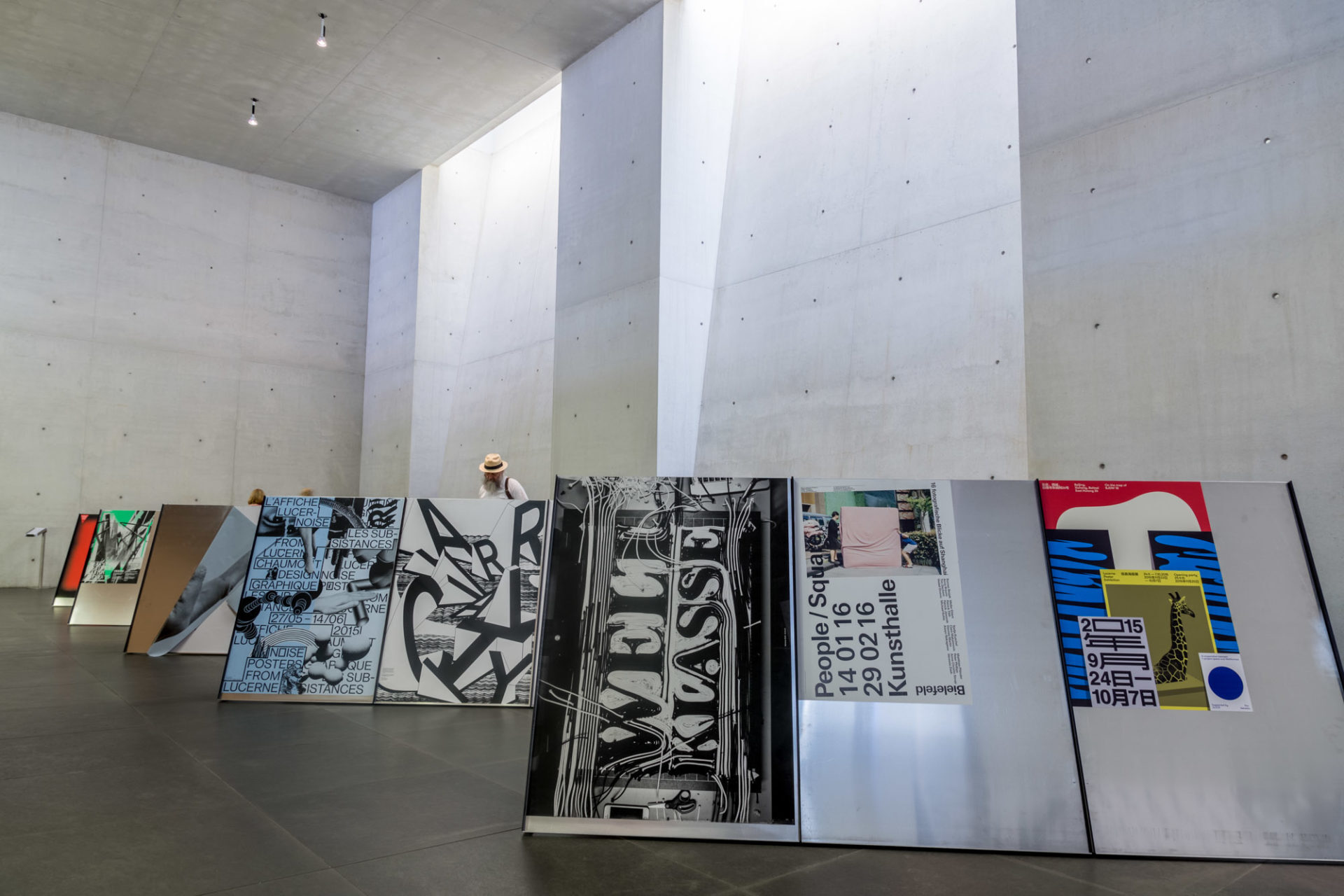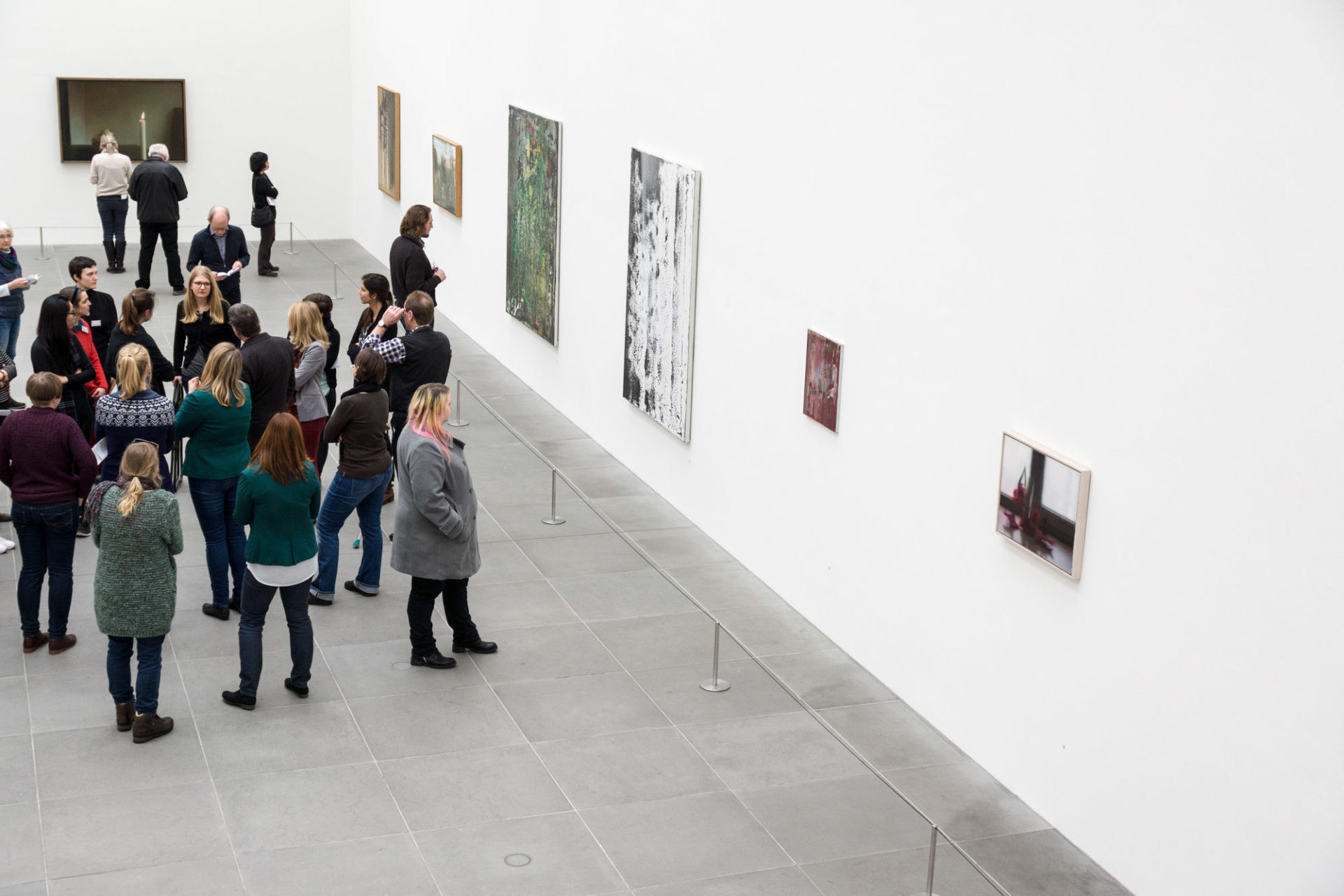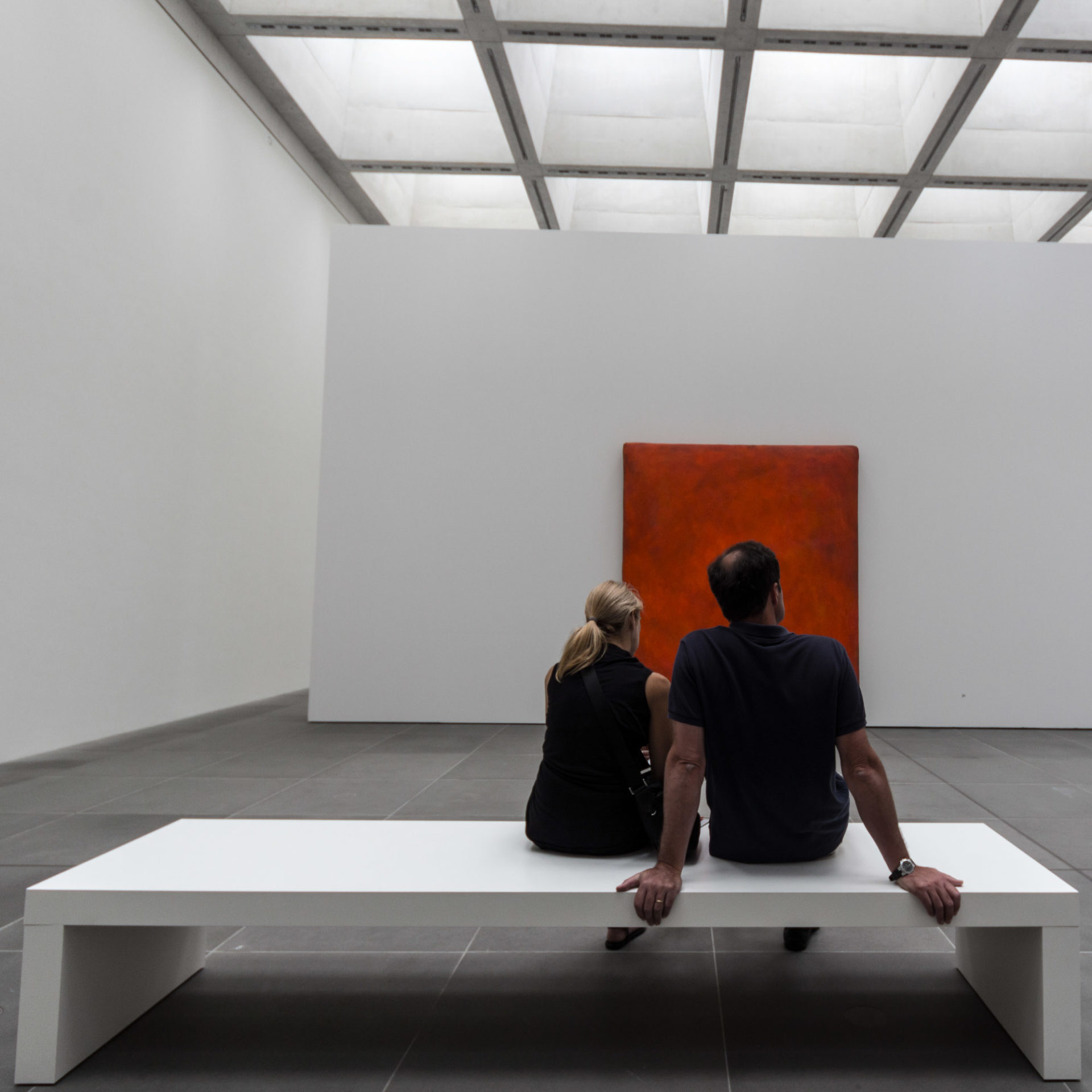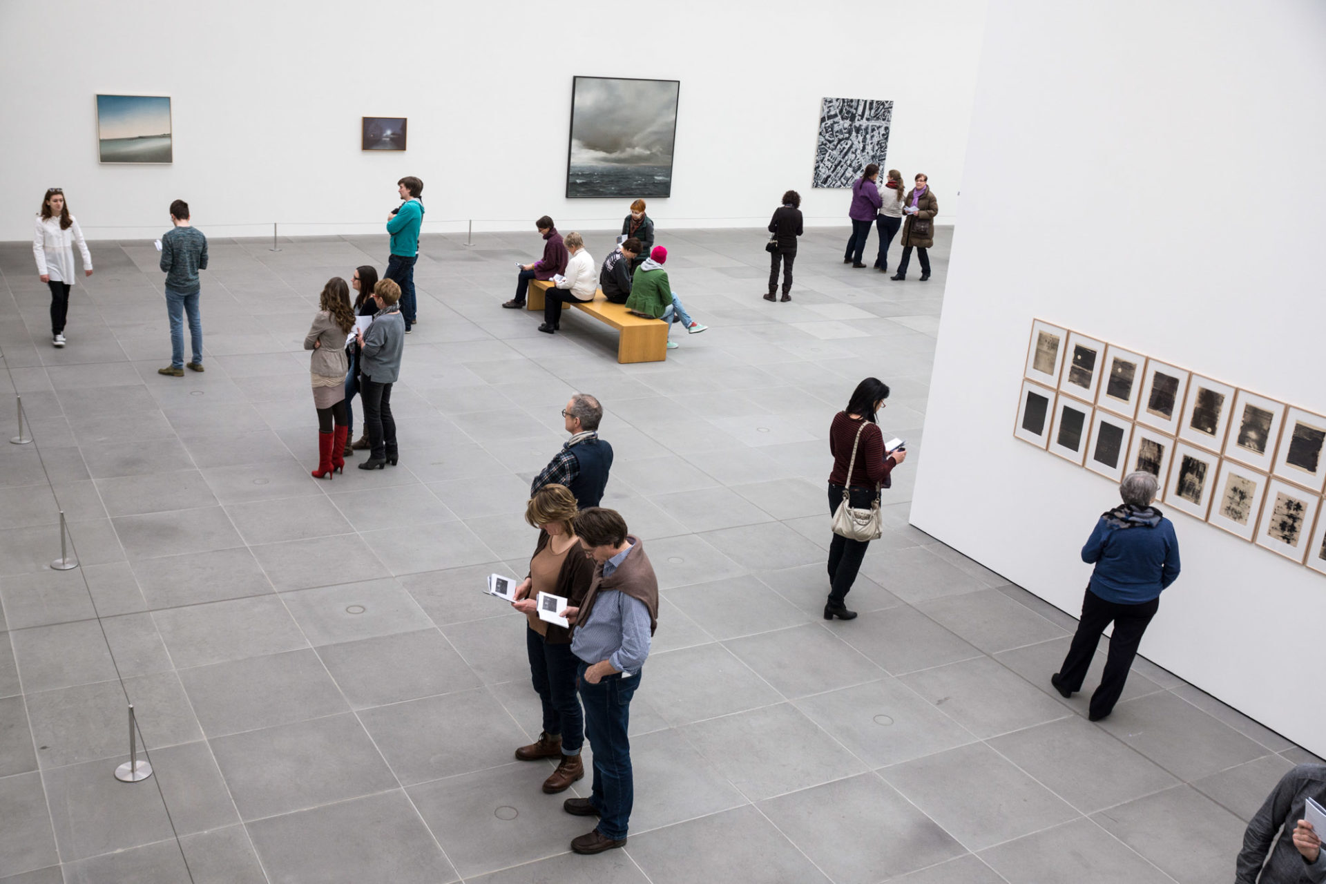 In diesem dritten Teil meiner Bilder vom „Neuen Museum Nürnberg“ betrachte ich die Ausstellungsräume selbst und die mehr zur Architektur gehörige Möblierung der Foyers. Zwei Dinge fallen einem als Fotografen sofort auf, wenn man die Ausstellungsräume betritt: Es herrscht ein gleichmäßiges helles aber doch diffuses Licht und die ausgestellten Werke haben alle sehr viel Platz um ihre eigenständige Wirkung entfalten zu können. Es macht als Fotograf richtig Spaß, in diesen großzügigen Räumen zu fotografieren (was ohne Stativ und Blitz erlaubt ist). Die Werke farblich richtig am Computer darzustellen ist ein einfacher Klick auf den Weißabgleich an der weißen Wand und schon hat man ein völlig neutrales Bild. Die Besucher kann man dabei vielfach mit in die Bildkomposition einbeziehen, um dadurch die Bildgestaltung nicht einseitig auf die Kunstwerke zu beschränken.