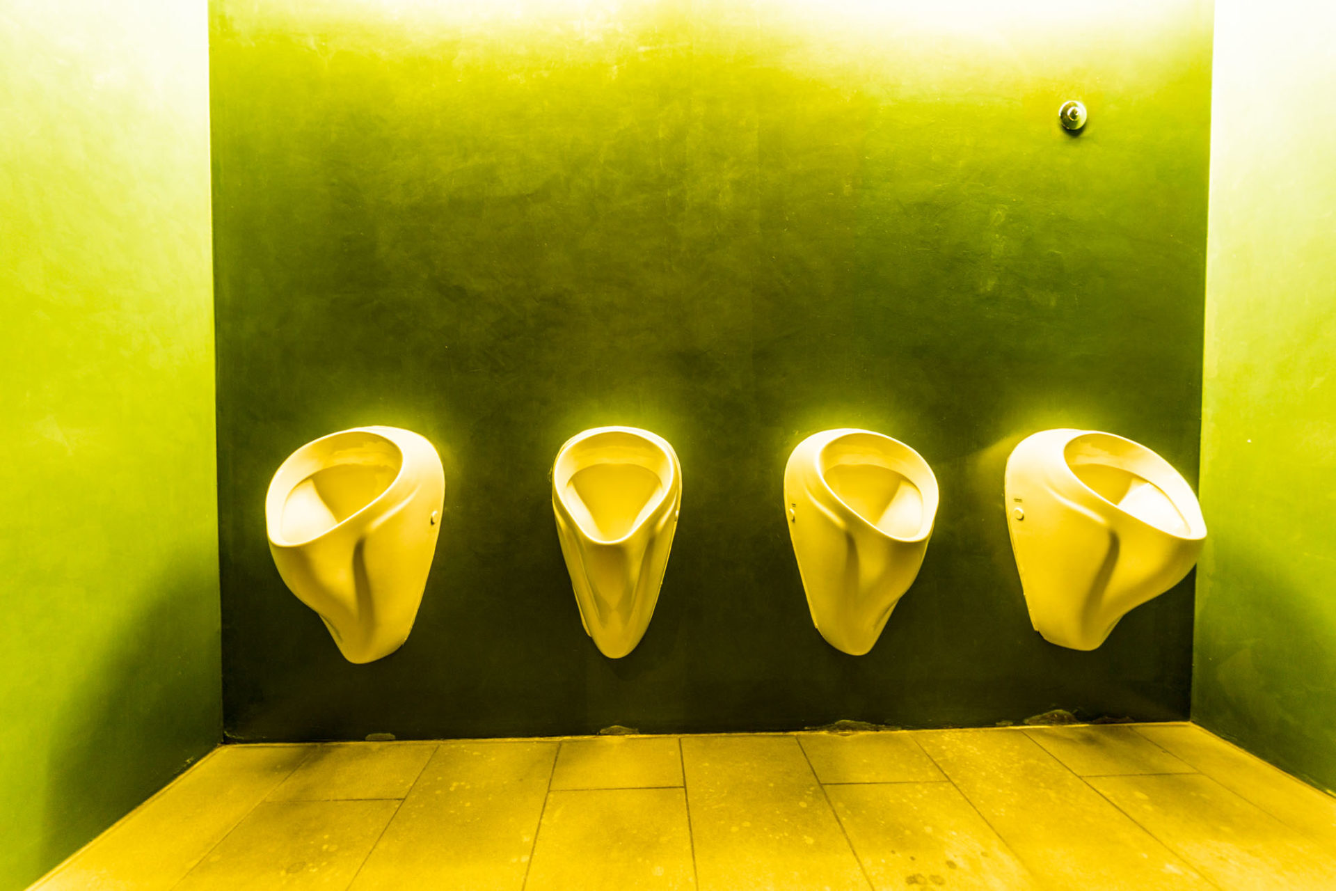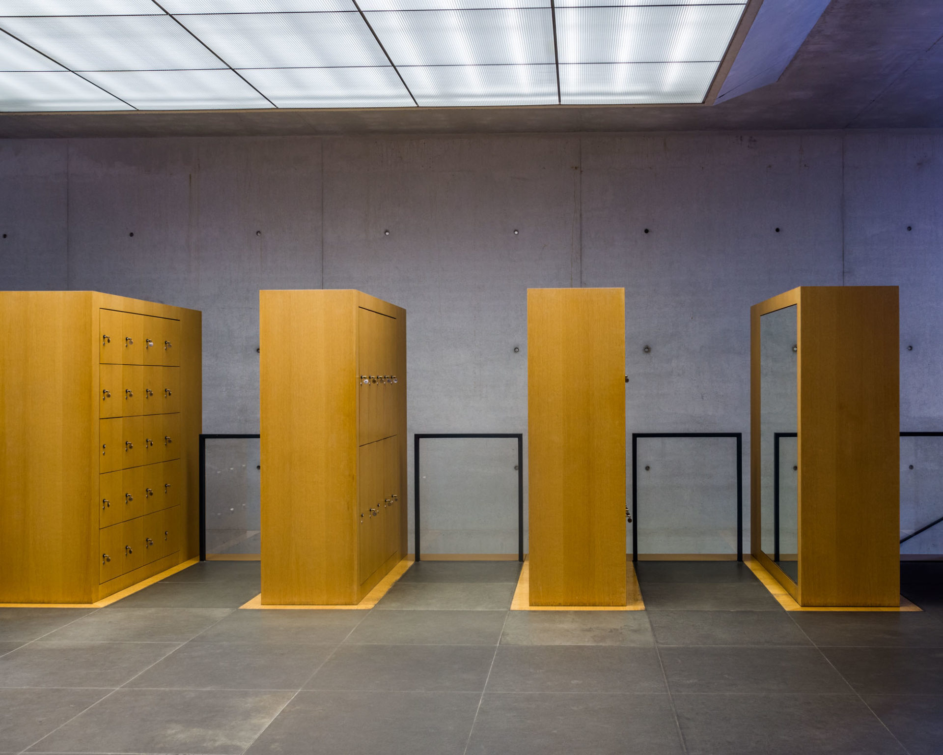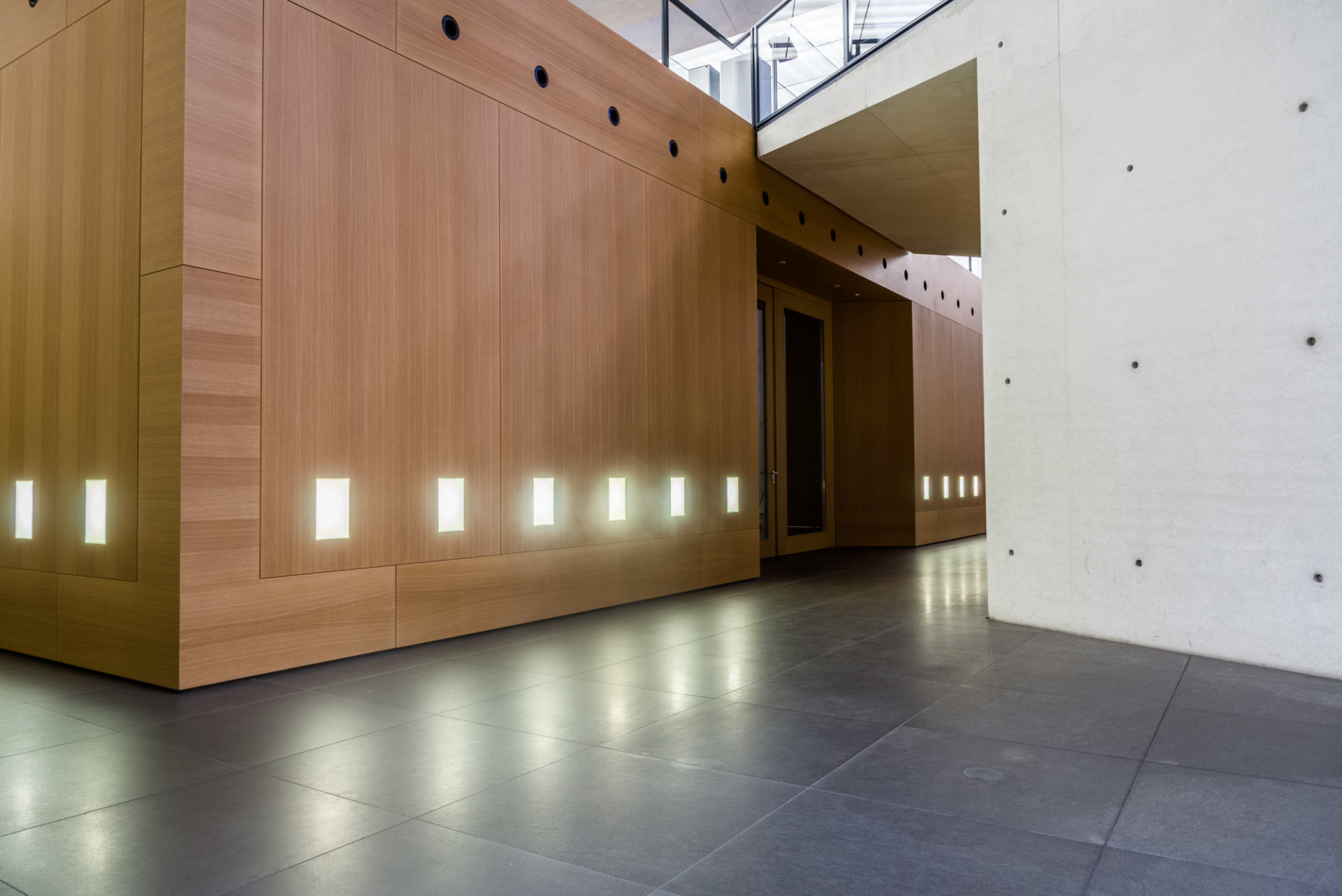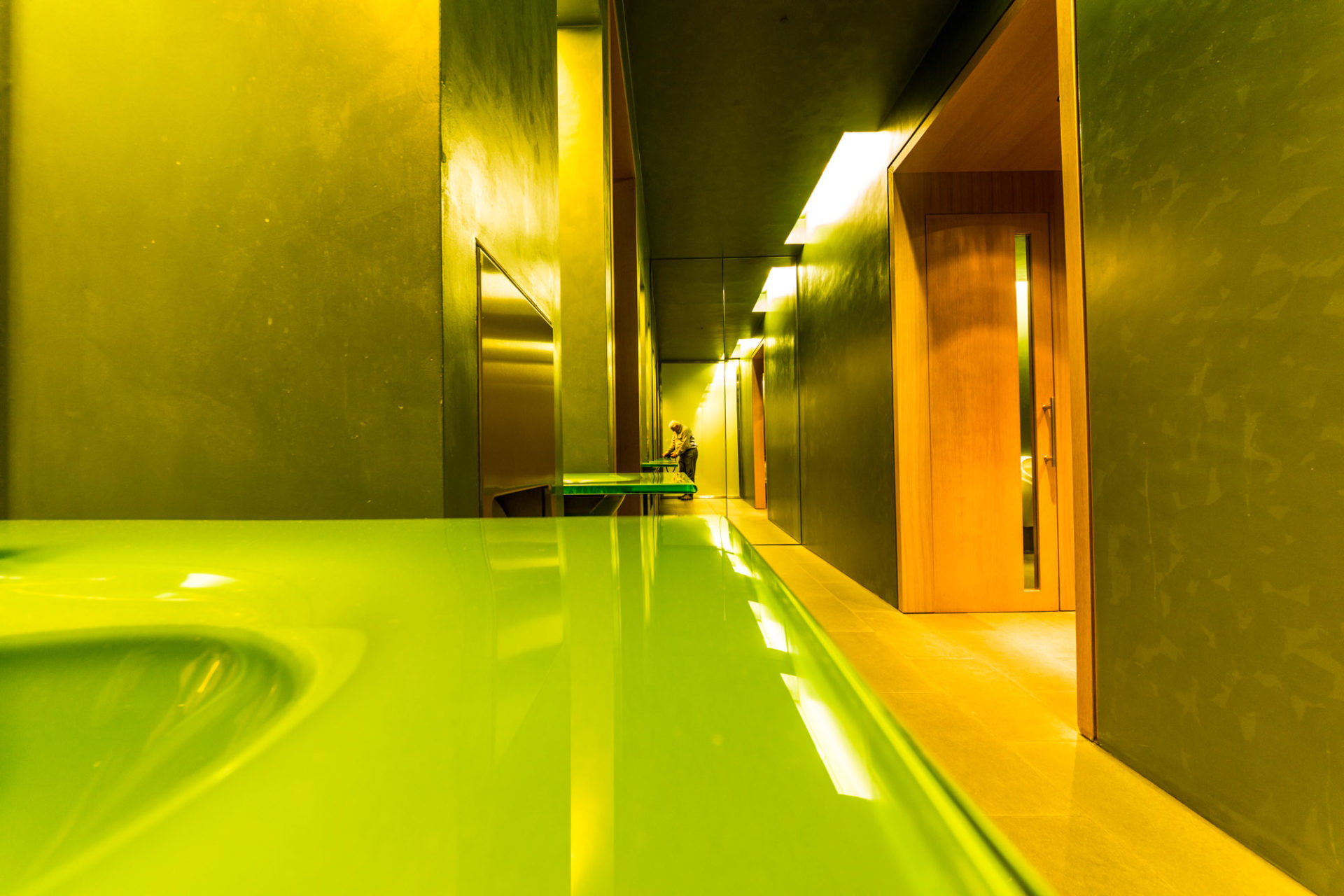 Der zweite Aspekt der Innenräume ist die „Einrichtung“ des Museums. Dies betrifft vor allem das obere und untere Foyer. Hier sieht man ebenfalls deutlich die Handschrift des Architekten, der mit schlichten modernen Holzmöbeln einen sehr dezenten Kontrast zur umgebenden Architektur des Hauses geschaffen hat. Nichts davon drängt sich hier in den Vordergrund, sondern ergänzt sich farblich harmonisch. Einen ganz besonderen Kontrast-Punkt habe ich dann doch noch entdeckt: nämlich die Waschräume und Toiletten. Diese bilden einen eigenständigen farblichen Schlusspunkt bei meinem fotografischen Rundgang durch dieses Museum.