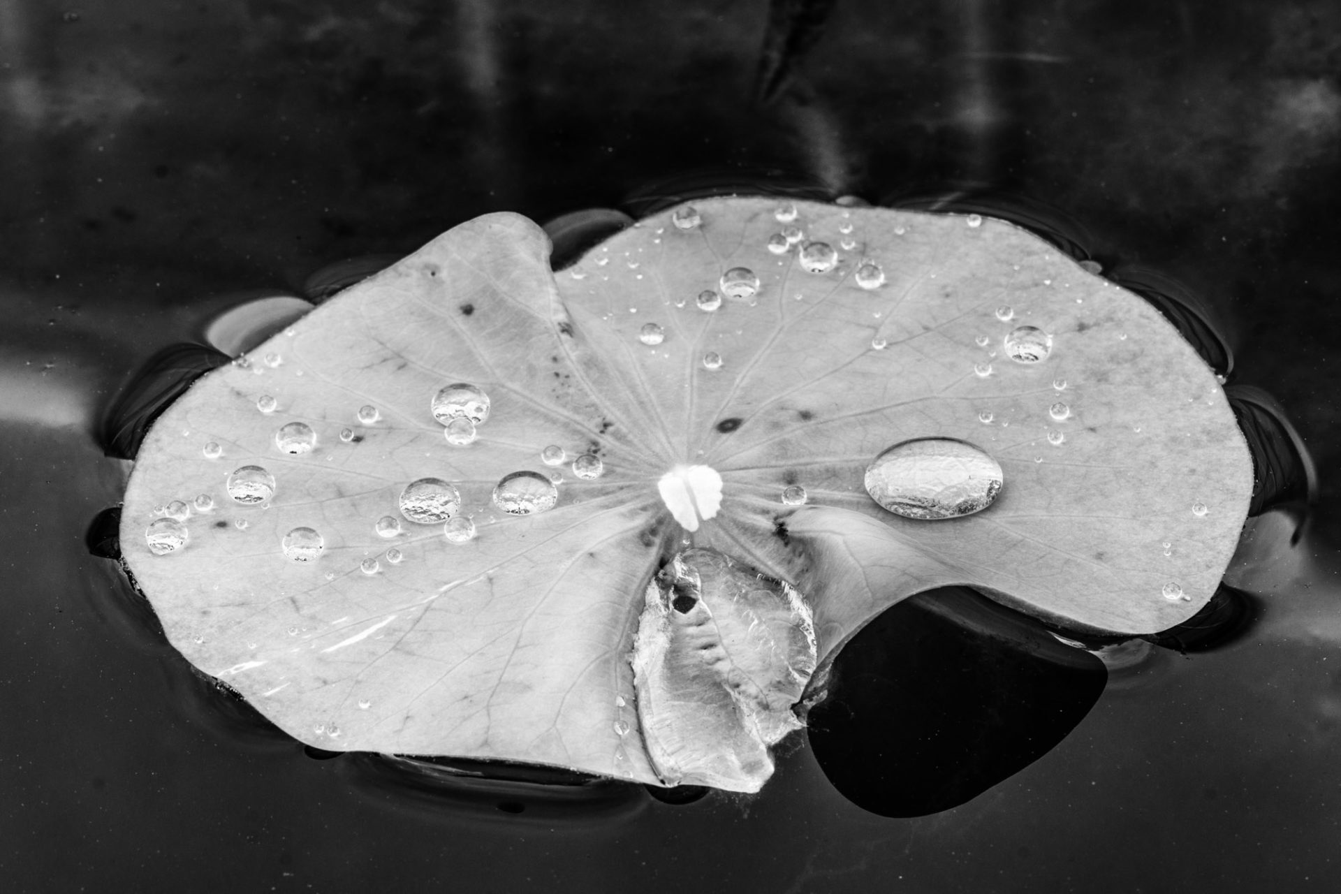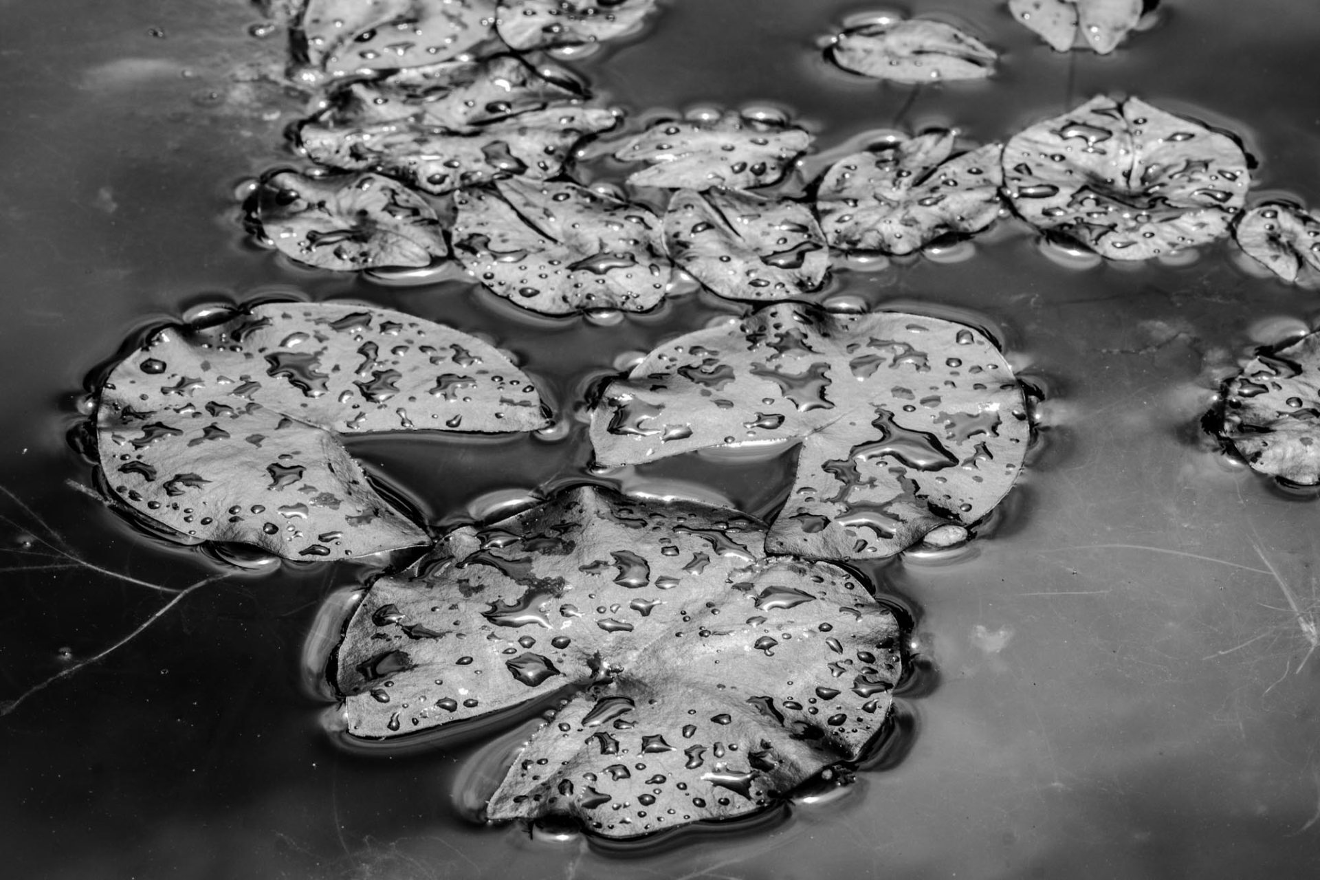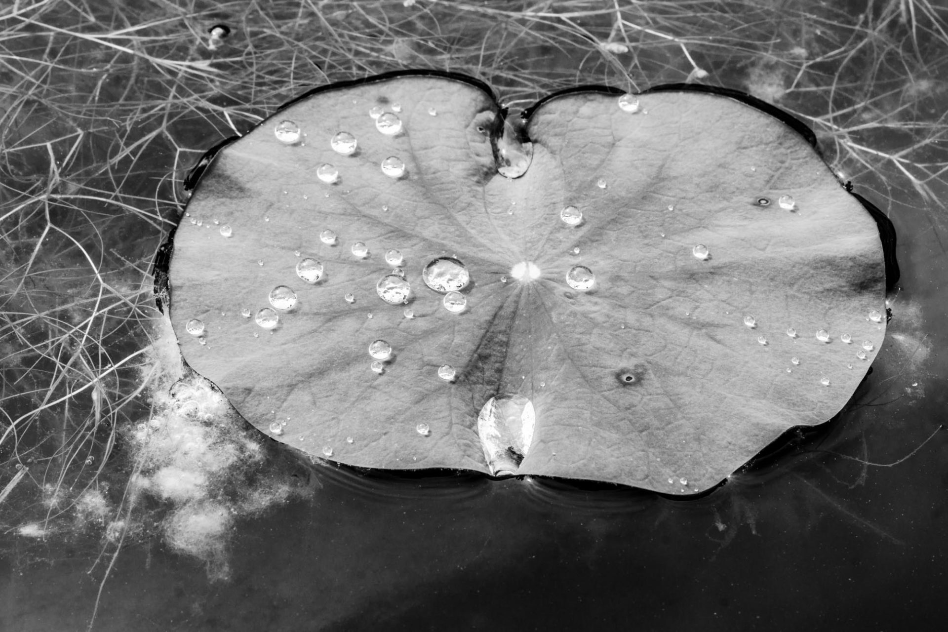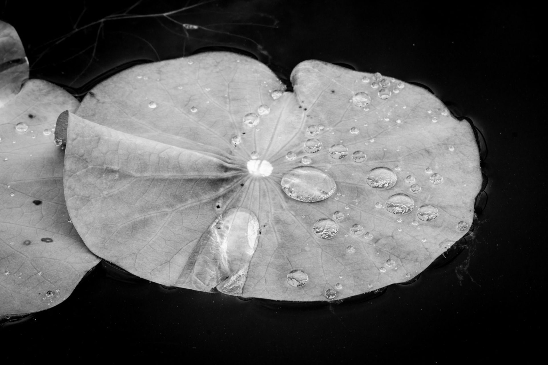 Gemeinsam mit einigen Fotofreunden hatten wir uns im Botanischen Garten in Erlangen verabredet. Es hat leicht geregnet und so habe ich gleich nach der Ankunft damit begonnen, die hell leuchtenden Wassertropfen auf den Seerosenblättern zu fotografieren. Am Anfang noch aus der Hand mit dem 50mm Objektiv, aber später dann mit dem 200mm Makro vom Stativ mit großer Blende (ca. f/13). Was ich hier von Beginn an im Kopf hatte, war eine Ausarbeitung der Bilder in schwarzweiß.