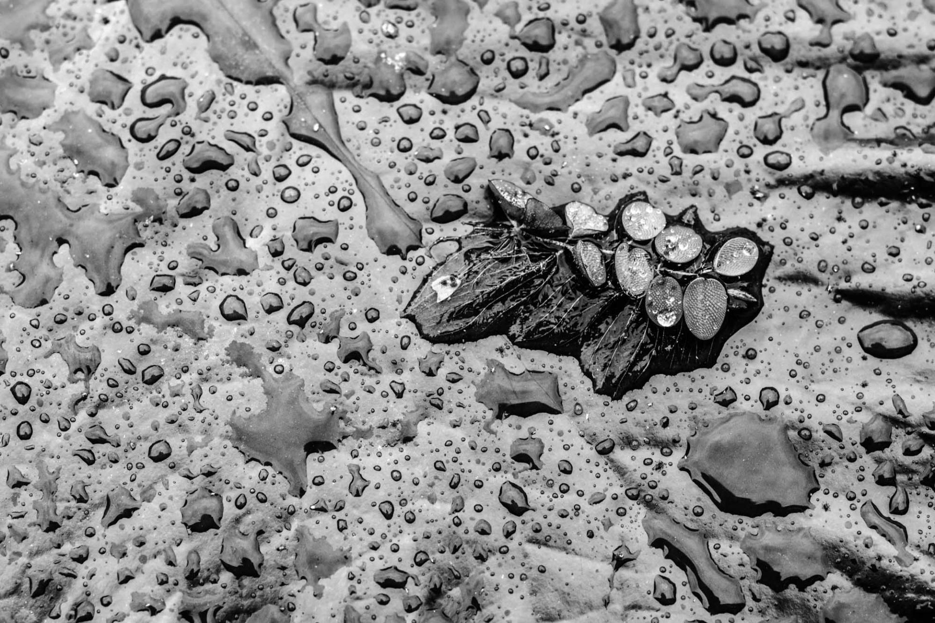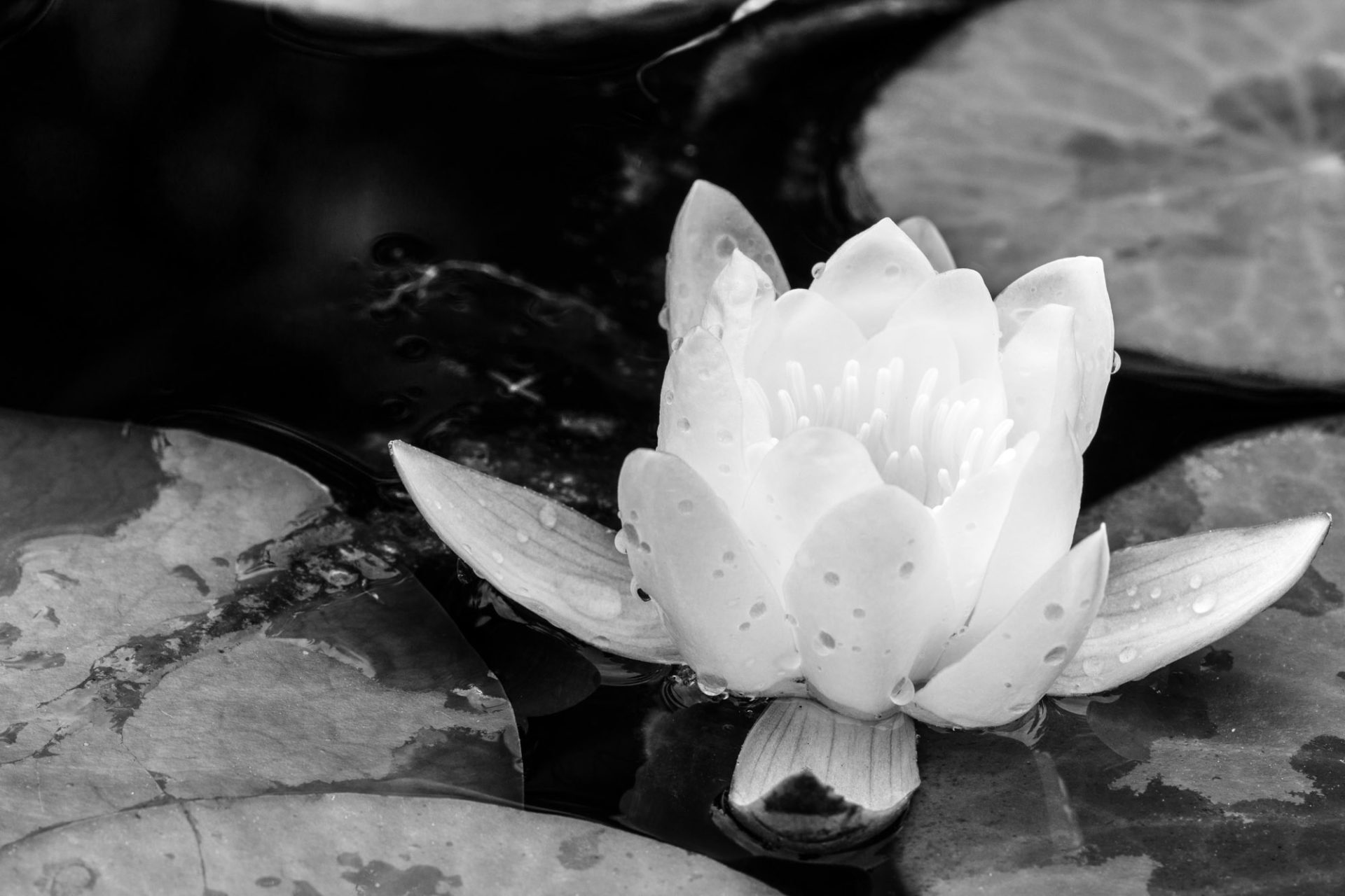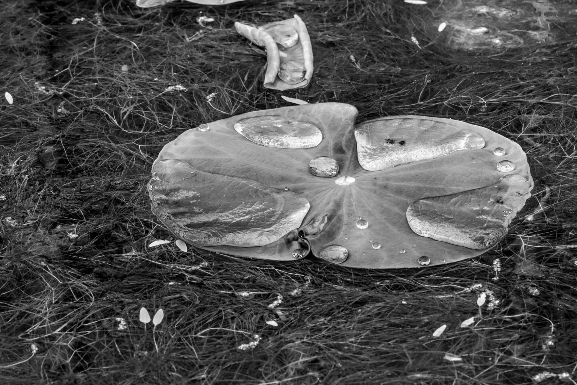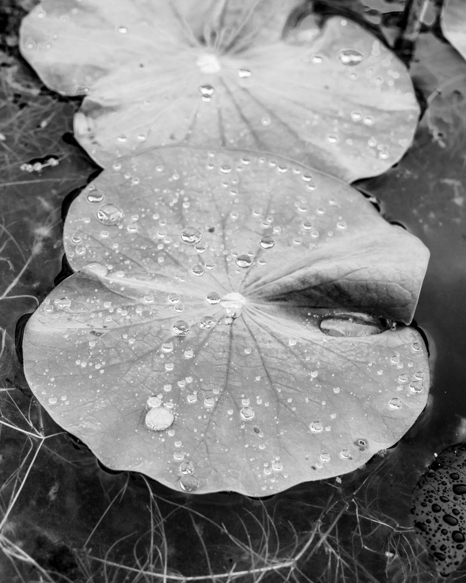 Gemeinsam mit einigen Fotofreunden hatten wir uns im Botanischen Garten in Erlangen verabredet. Es hat leicht geregnet und so habe ich gleich nach der Ankunft damit begonnen, die hell leuchtenden Wassertropfen auf den Seerosenblättern zu fotografieren. Am Anfang noch aus der Hand mit dem 50mm Objektiv, aber später dann mit dem 200mm Makro vom Stativ mit großer Blende (ca. f/13). Was ich hier von Beginn an im Kopf hatte, war eine Ausarbeitung der Bilder in schwarzweiß.